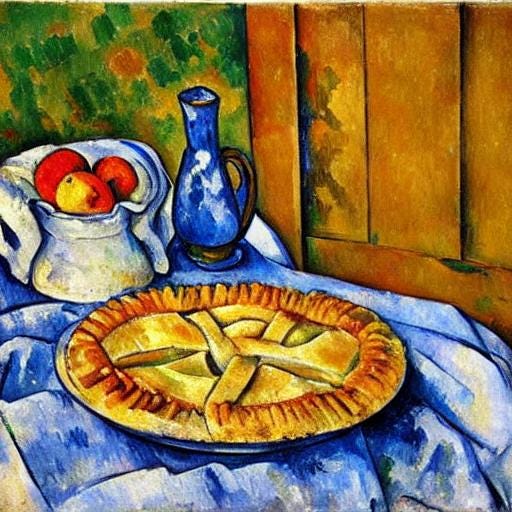 Avec une pomme j'étonnerai ParisSome things are more apple pie than America. They are the still life paintings by Paul Cézanne.Christine Newton BushJul 06, 2024ShareText within this block will maintain its original spacing when publishedAnticipating particle physics with paint objets nouménauxJonatha Chance | Copyright © 2024 CC-BY-NC-ND (4.0 International)Image conjured by Christine Newton Bush with Substack Generative AI | Copyright © 2024 CC-BY-NC-ND (4.0 International)PreviousNext