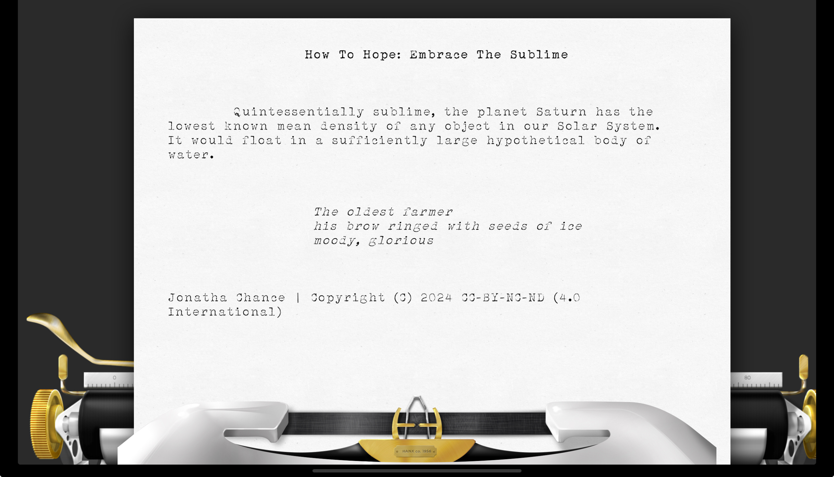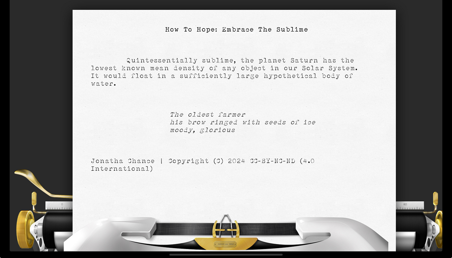 How To Hope: Embrace The SublimeQuintessentially sublime, the planet Saturn has the lowest known mean density of any object in our Solar System. It would float in a sufficiently large hypothetical body of water.Christine Newton BushDec 19, 2024Share17 sounds by Jonatha Chance rendered upon the Hanx Golden Touch virtual typewriter with Hanx Writer app: “The oldest farmer / his brow ringed with seeds of ice / moody, glorious” | Copyright © 2024 CC-BY-NC-ND (4.0 International)Image conjured by Christine Newton Bush from stock imagery using Adobe Express | Copyright © 2024 CC-BY-NC-ND (4.0 International)PreviousNext