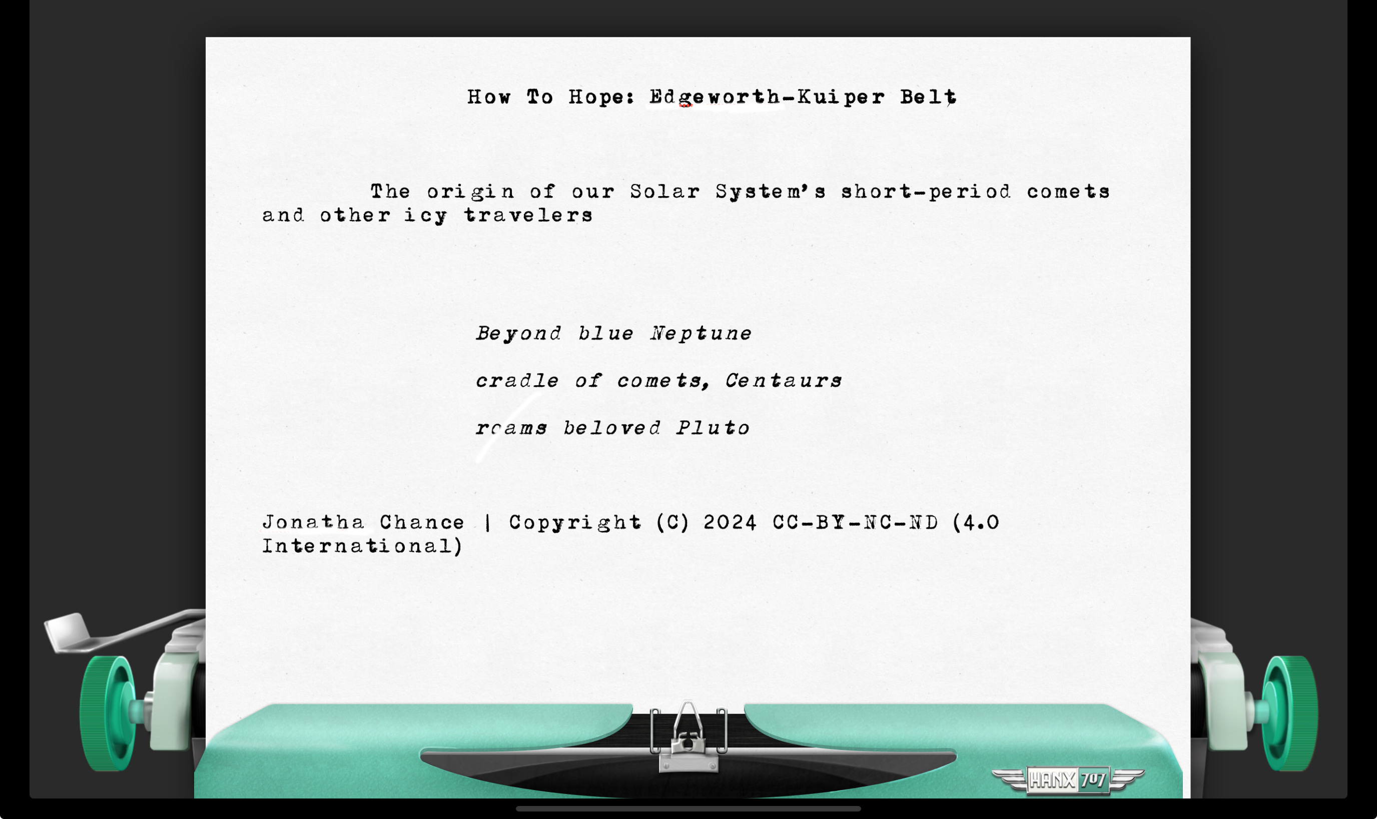 How To Hope: The Edgeworth-Kuiper BeltThe origin of our Solar System’s short-period comets and other icy travelersChristine Newton BushNov 24, 20241Share17 sounds by Jonatha Chance: “Beyond blue Neptune / cradle of comets, Centaurs / roams beloved Pluto” rendered on the Hanx 707 virtual typewriter with Hanx Writer app | Copyright © 2024 CC-BY-NC-ND (4.0 International)Image conjured by Christine Newton Bush with DALL-E 3 AI and further enhancement with Adobe Photoshop for iPad Pro | Copyright © 2024 CC-BY-NC-ND (4.0 International)PreviousNext