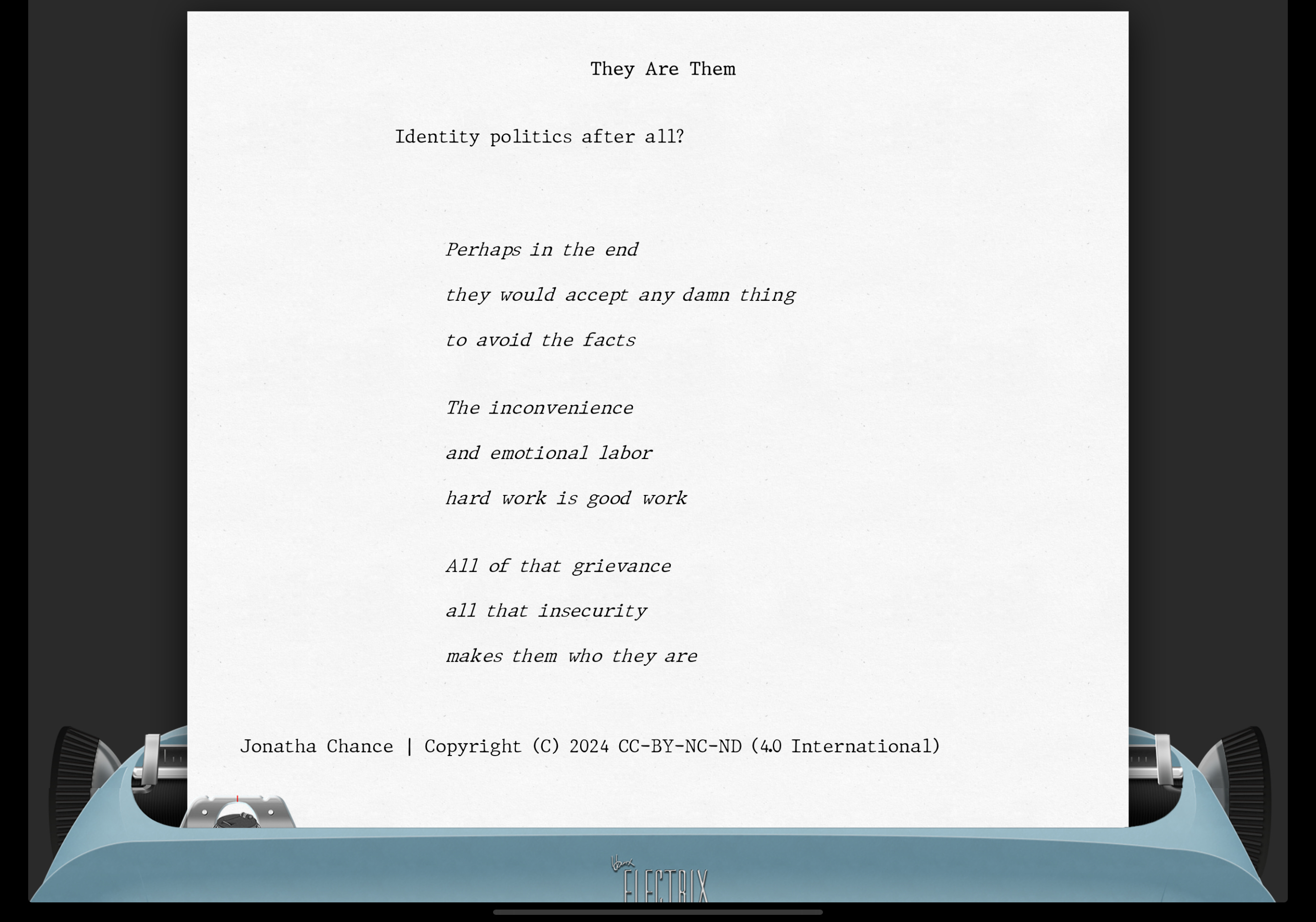 They Are ThemIdentity politics after all?Christine Newton BushNov 17, 2024ShareThree stanzas of 17 sounds by Jonatha Chance: “Perhaps in the end / they would accept any damn thing / to avoid the facts // The inconvenience / and emotional labor / hard work is good work // All of that grievance / all that insecurity / makes them who they are” | Copyright © 2024 CC-BY-NC-ND (4.0 International)Image conjured by Christine Newton Bush with DALL-E 3 | Copyright © 2024 CC-BY-NC-ND (4.0 International)17 Sounds is a reader-supported publication. To receive new posts and support my work, consider becoming a paid subscriber. Thanks!SubscribePreviousNext